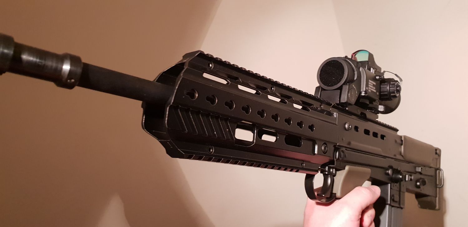 Bill_the_bear Posted August 14, 2020 Author Posted August 14, 2020 15 hours ago, SeniorSpaz87 said: Any idea if one of these would fit on a STAR/ARES L86? Id love to give my longboi a makeover, but Im unsure as to the compatibility between the 85 and 86. I've seen it fitted on an L86, but I'm unsure which brand of L86 it was (I know nothing about the L86, is there more than one brand?). EDIT: it goes on an ICS L86 but until the designer gets hold of an Ares to make a compatible mounting block it doesn't go on that, well unless the Ares would take one of the existing G&G, ICS, WE mounting blocks, which I guess no one knows right now. Sorry. 15 hours ago, Mad-Al said: Sorry noob question but can you get adapters to fit side rails for these? They are producing their own side rails. I haven't got any yet. It's "not compatible" with normal keymod, though that doesn't mean they won't work, I might try some to see. 15 hours ago, Mad-Al said: how well do the batterys fit? do they go in the same place and are the easy to get to? I'm looking for a setup like this for my first gun, I did my marksman on an L85 but would rather go tactical with it! Battery space is much improved. With the A2 handguard I couldn't get one of my 7.4v Titan batteries in as they are slightly larger dimension than the usual lipo size. With this handguard I can get one 7.4v Titan in below the barrel, or a 11.1v Titan nunchuck in, half below and half above the barrel, if you are careful with the wiring. Attached pic with the 7.4v in positioned so you can see it better (its in the 2nd and 3rd pic of the original post but less visible. The G&G wiring has a short removable section that runs from the ETU in the lower, through a cut out just under the outer barrel, and into the handguard. Thats all still there with the EK3 rail attached, so you just slide the battery into the front of the rail and connect it up. You can remove the rail to get better access to the wiring if you need.