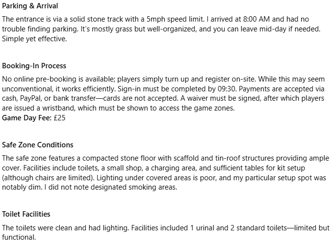 Colin Allen Posted May 28 Posted May 28 8 hours ago, Jaylordofwaargh said: Spent my Sunday in the protected valley of the Dragon Lair. All in a decent site with a couple of limitations, the team are friendly and welcoming, safe zone is well covered and they are still improving the site to create more game play spaces. It's even easy to get to if you ignore the £25 in public transport and cab fees....for the day, which I don't mind (too much). The no bang grenade sucks but they do have a toxic gas rule to aid the balance of that, and they are on hotel grounds, so I get it. Speaking of the hotel- they serve lunch, a good size pizza and garlic chips for the boy and I to share, bargain really. The games themselves were mostly well thought out, and the medic rules they used for some of the games worked really well. I did try flanking on the left valley edge aiming for the plane with a small group to recover the gold. However we got held up by a couple of really determined and very well placed lads kept halting our advance. There are a couple of choke points that fuel to shape and size of site are tough to break but all together good fun. I will be back I haven't been since they did the most recent work and, based on photos, am slightly concerned that it seems to be turning into an outdoor CQB site; is that the case? The choke points are a bit of a pain, but unavoidable given the slightly unusual shape of the site. I do miss the old Dragon's Lair.