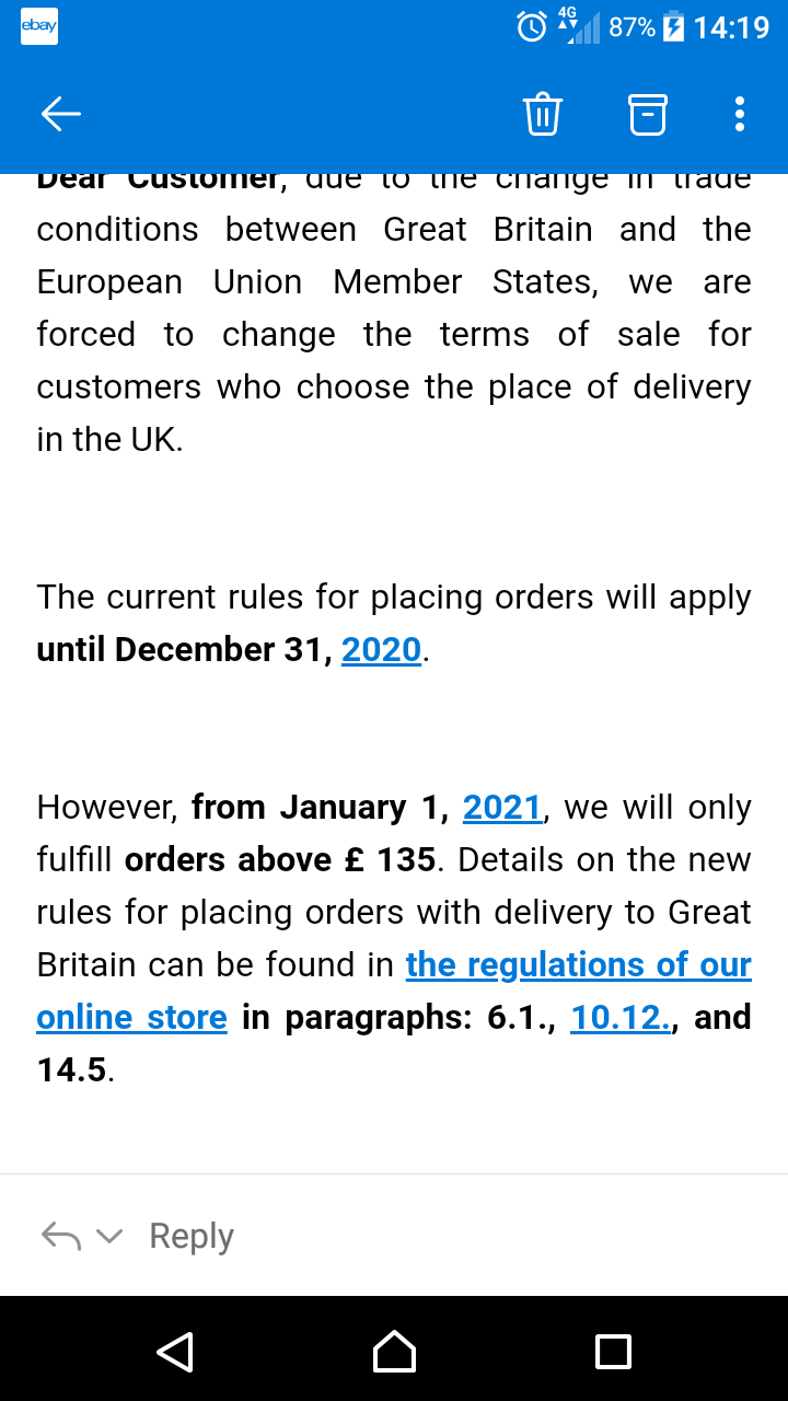 Tactical Pith Helmet Posted December 28, 2020 Posted December 28, 2020 Sales over £135 from the EU to GB are liable for VAT payable by the importer post 1/1/21. Under £135 the process looks more complicated with the possibility that some kind of registration on the part of the seller may be required. Have a gander at this from Question 6 onwards: https://www.accountancyeurope.eu/publications/vat-customs-duty-and-brexit-prepare-now/