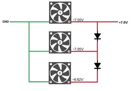 Tommikka Posted June 12, 2021 Posted June 12, 2021 There are two ways that you can build a circuit with multiples of the same item, in series or in parallel. In series is a single circuit one after the other. You connect your battery plus to the switch, then to the first fans plus. Connect the first fans negative to the second fans plus …. And so on, finally connecting the last negative back to the battery. In series you effectively reduce the voltage received by each fan. Four fans on a 7.4v circuit will each get under 2 volts (if one fan loses a beat and stops then the whole circuit could be broken and they all stop) In parallel is treating each the fans as it’s own circuit. Connect the switch to the battery’s plus again. But connect each of the fans plus wire directly to the switch and their negative wire back to the battery In parallel every fan gets the full voltage - and doesnt affect the rest other than sharing the power (but in practice the voltage might differ a little between them as in the example below)