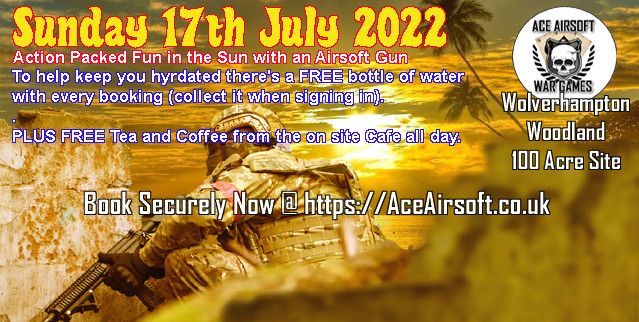 Ace Airsoft War Games Posted July 12, 2022 Posted July 12, 2022 Sunday 17th July 2022, an Action packed day of Fun in the Sun with an Airsoft Gun. It's going to be a scorcher so we'll be giving away a FREE bottle of still water to help keep you hydrated for every player that has pre booked by midnight Friday 15th. There's also FREE Tea and Coffee all day long available from the on site cafe. BOOK ON ASAP ?? https://aceairsoft.co.uk/tinyurl/17thjuly2022 Hope to see you there!