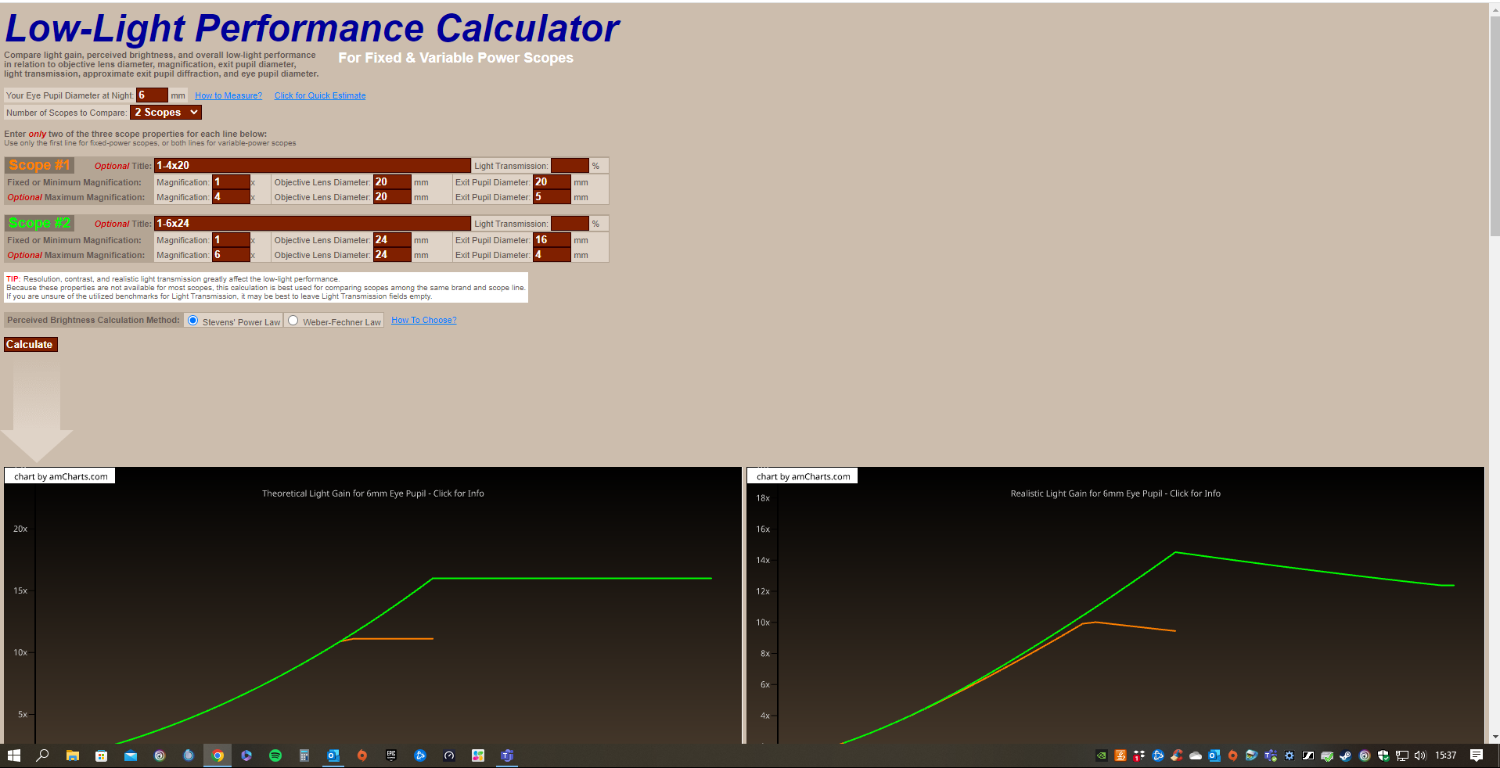 Supporters Lozart Posted February 8, 2023 Author Supporters Posted February 8, 2023 Seems I may have answered my own question! I'm going to leave this thread up though as it may help others; scopecalc.com lets you put in your scopes info and then maps out the brightness etc using flash player (so you'll need an emulator but there's some good plugins around for chrome). Basically it would seem that at any magnification I'm likely to use the two perform pretty much the same in terms of light transmission and usable image but (as suspected) the one with the larger objective gives a better size of image. Pics below for the rest of the nerds here! linky to calculator