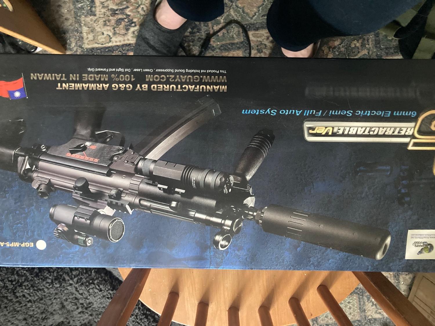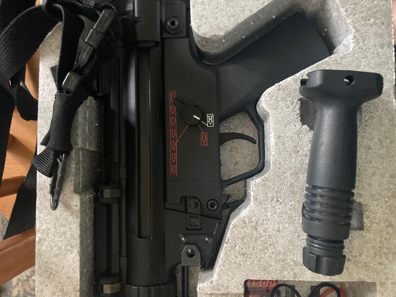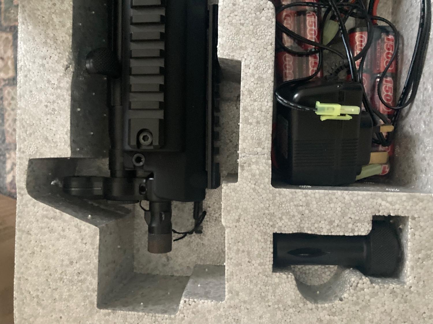 Further info: still in original box, with the manual, two sets of battery packs, plus the charger for them, 4 stick magazines (unsure what cap they are), plus sling, vertical foregrip and metal flash hider.