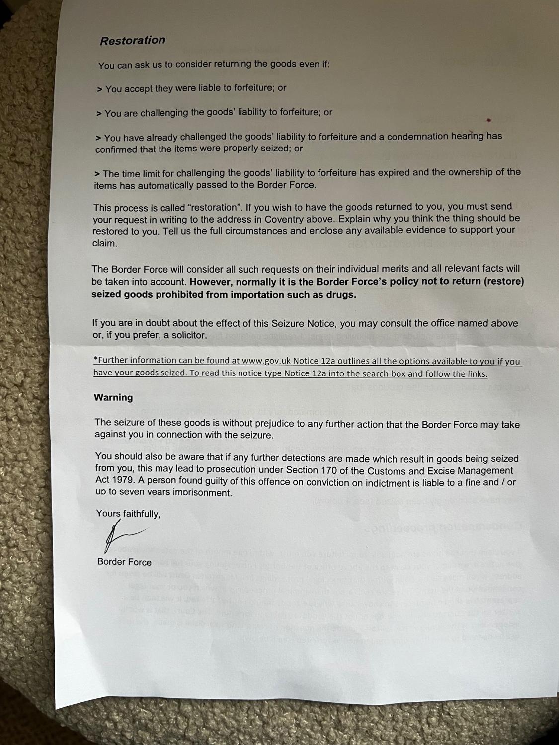 Neptune Posted December 1, 2024 Posted December 1, 2024 I've been through this several times, the last one was just last week. You've already been given the advice you need, but I thought I would add to this thread... They can absolutely seize it under Section 36 of VCR Act: "(7) A realistic imitation firearm brought into Great Britain shall be liable to forfeiture under the customs and excise Acts." The defences in Section 37 apply when you are charged with an offence, which Border Force aren't doing. In reality they will release it to you provided you have a defence, at least they have in all of my seizures going back 10+ years. The letter does cover it, but if it isn't clear, you want "Restoration". Write to them at the address provided, make sure your name and address is on the letter, provide them with your defence, IE, UKARA number and the site you play at. They have access to UKARA, which makes me think maybe it wasn't on the box, or wasn't clear. I would also advise to add your email on it to and ask them to contact you that way if there are any further issues, you don't want to be going back and forth by post. You also have to provide an invoice or receipt of the goods, again this should have your name and address on. Failing that, Border Force do take bribes; Send them a box of Ferraro Rochettes and all your problems will be solved. Good luck. Rogerborg 1